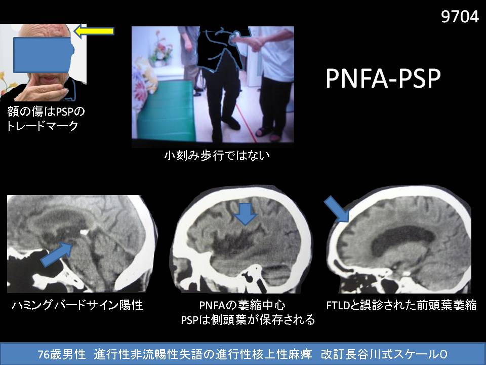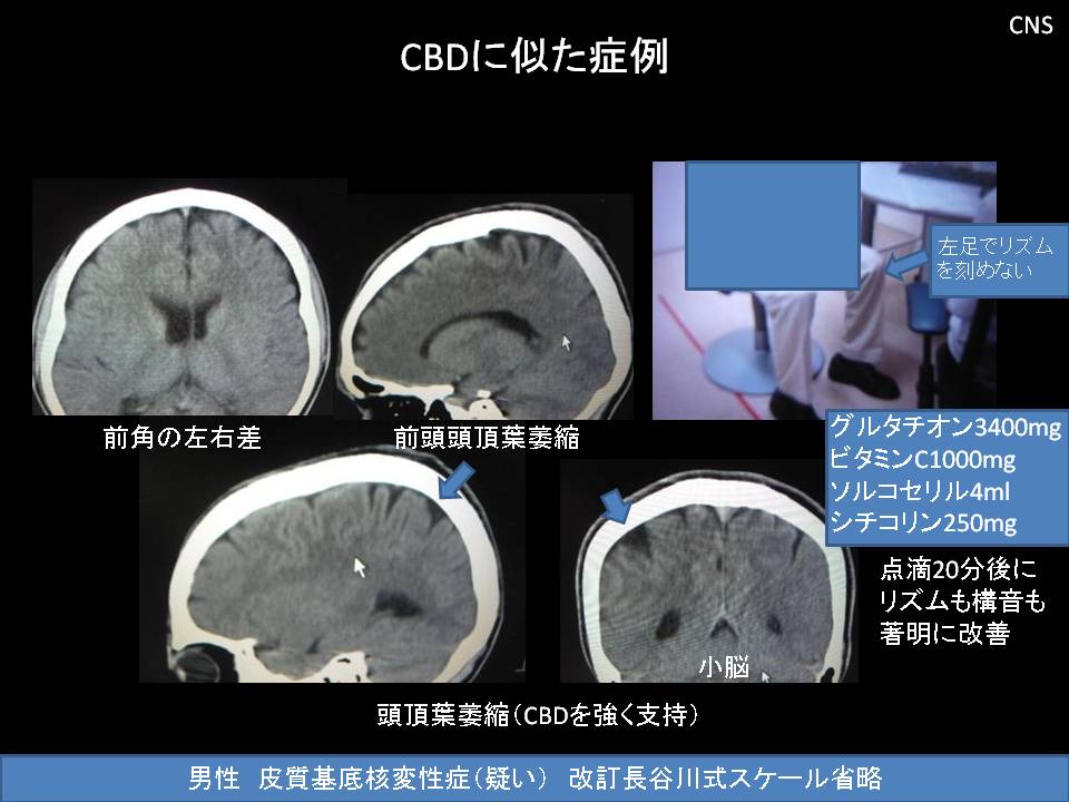 ハミングバードが陰性、多少側頭葉萎縮に左右差があり、点滴が効きにくいとなりとCBDとの鑑別が必要になるが、彼女はあくまでも下半身が悪いのであって手は使える。間違いなくPSPであるが、彼女特有なのがまるでDLBかのように、とても声が小さいことである。