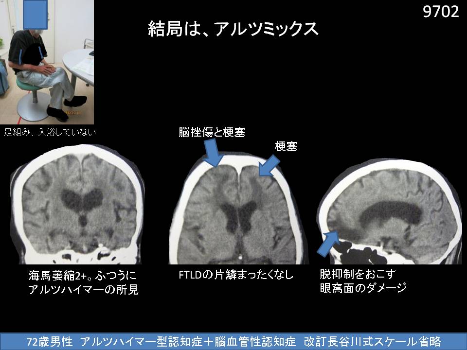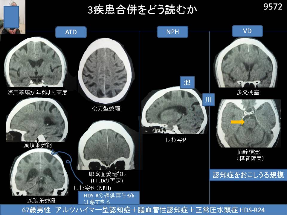 67歳男性。いちおう奥さんと来られましたが元気で運転も上手です。歩行障害、尿失禁はないです。改訂長谷川式スケールは24とれるのですが遅延再生が3点しかとれないので相対的にアルツハイマーパターンと言えます。